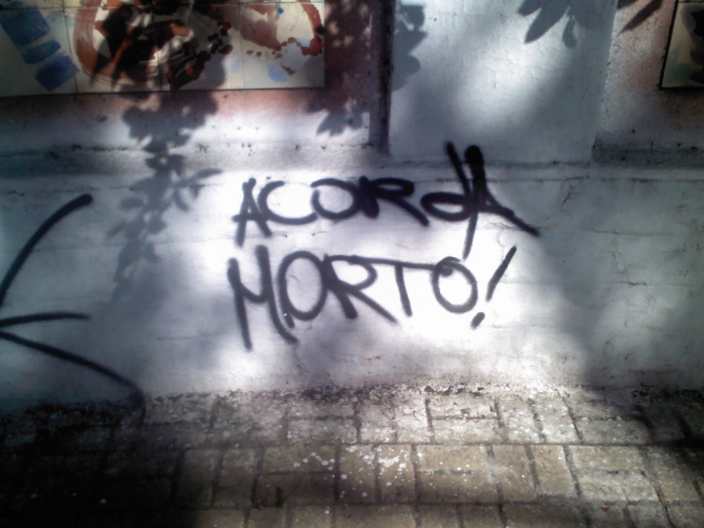 “5. Há uma pichação no Cemitério da Cardeal Arcoverde pelo qual guardo muito espanto. É bruta e ruidosa, são dois versos, um grito: ACORDA MORTO! Gosto porque não tem vírgula, só ponto de exclamação…!). Leio esse mandamento todo dia de manhã: acordamorto, acordamorto, acordamôr; acorda, amor; acorda, morto; acorda morto. Gosto porque é um chamamento à ressurreição e gosto porque, sem a vírgula, parece estar falando não com os mortos, mas com os passantes, os que espiam rapidamente pela janela do ônibus a caminho do trabalho: Você acorda morto, Você está acordado, mas não está vivo. Gosto dessa involuntária maldição ao trabalho sem alegria, trampo de mundo caduco, serviço. Acorda, amor. Vence a morte.